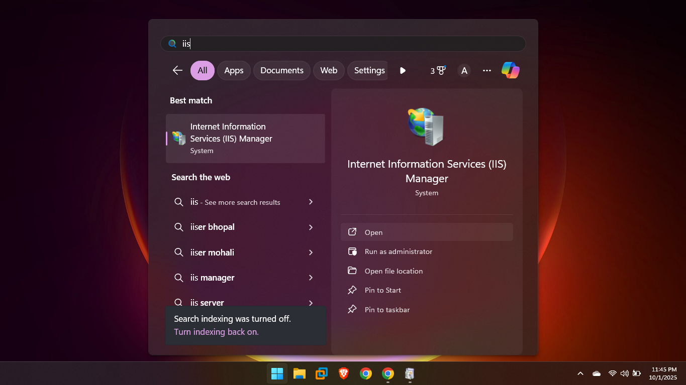 Open Internet Information Services (IIS) Manager. You can find it by searching for it in the Start menu or by going to Control Panel > Windows Tools (or Administrative Tools) > Internet Information Services (IIS) Manager.