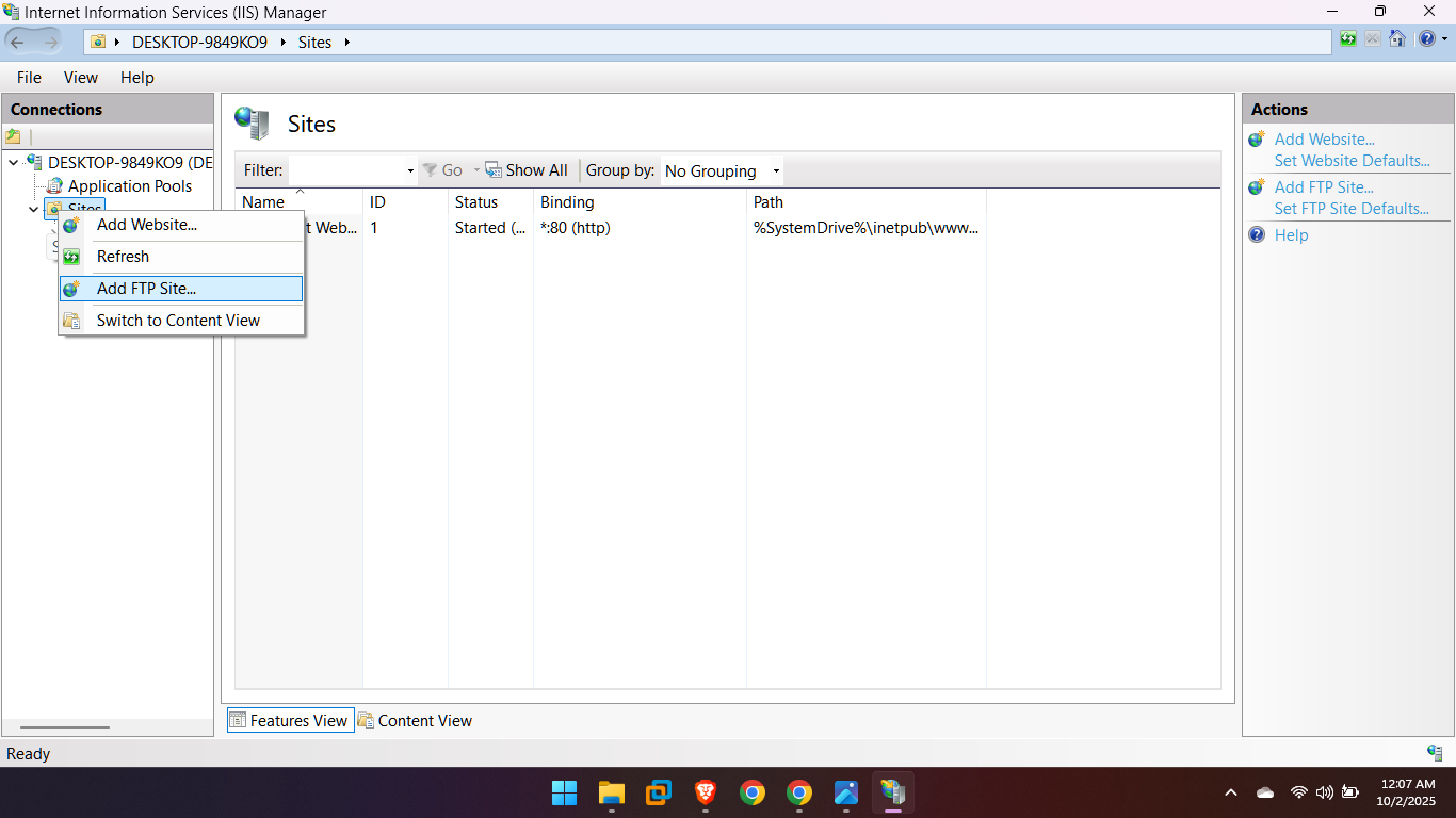 In the Connections pane on the left, expand your computer name and then right-click Sites. – Select Add FTP Site… –