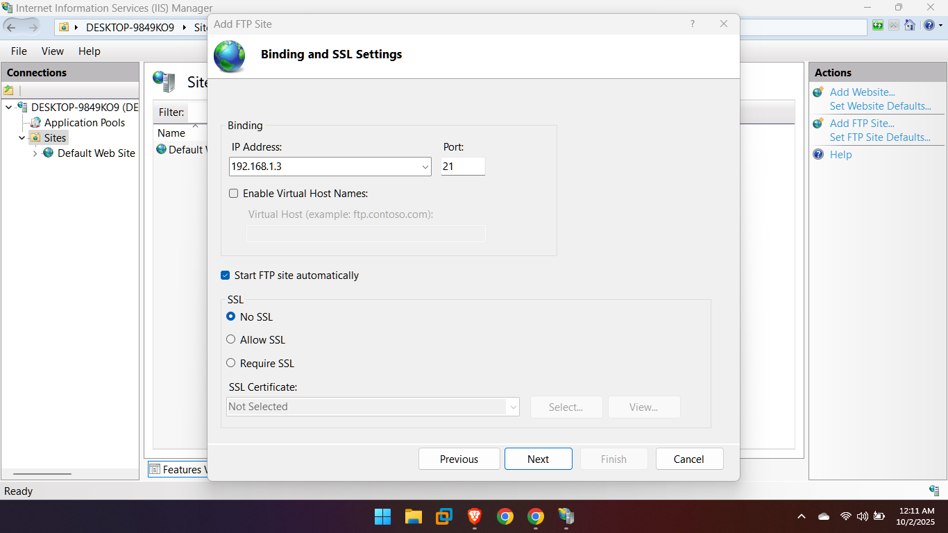 FTP site name: Enter a name for your FTP site (e.g., “NewFTP”) – Physical path: Browse to or enter the path of the folder you want to use for the FTP files (this is the folder people will access).