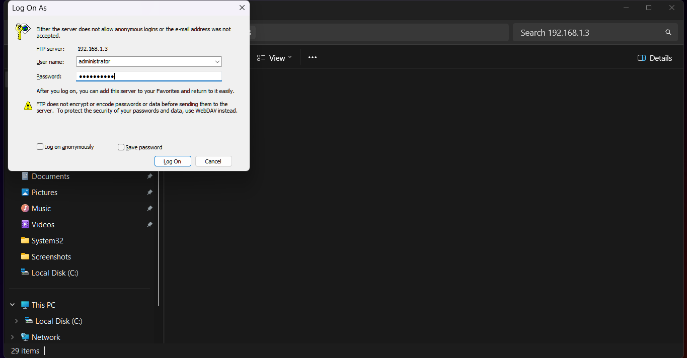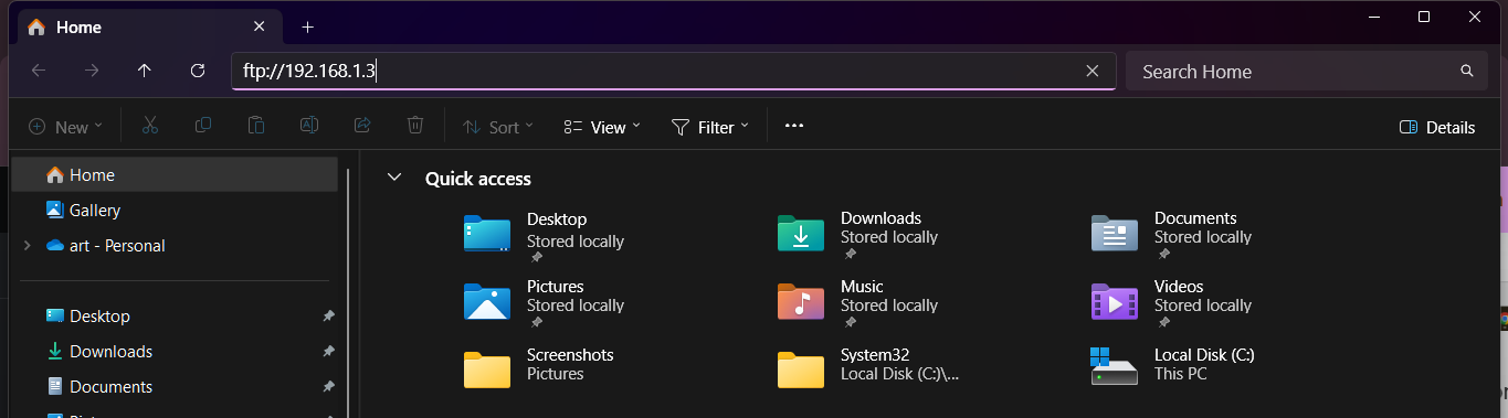 Your FTP server is now set up and ready to be accessed by a client (like FileZilla) using your computer’s IP address (e.g., ftp://192.168.1.3) and the credentials of any user.
