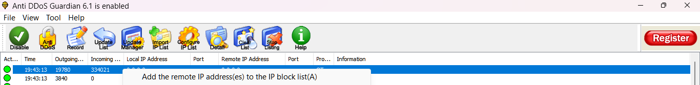 4. Confirmation: The blocked session should turn a distinctive color (e.g., red) in the main window’s “Action Taken” column, …confirming the IP is now blocked by your Anti-DDoS Guardian.