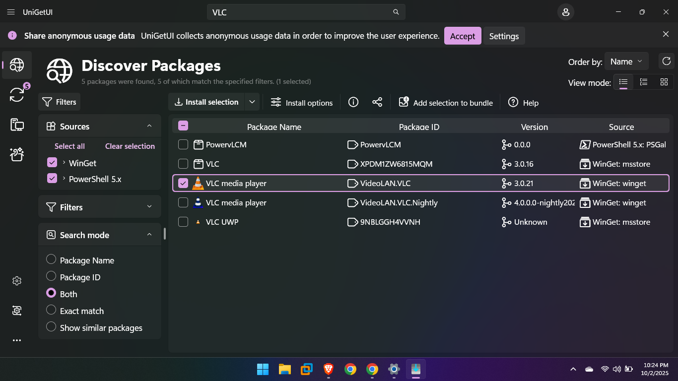 Select the desired application and keep in mind source should be only (winget or msstore package manager source)
